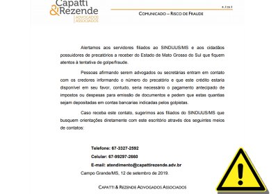 A direção-geral do Sindicato dos Trabalhadores do Poder Judiciário de Mato Grosso do Sul (SINDIJUS-MS) alerta os filiados de risco de fraude referente a comunicações acerca de supostos pagamentos de precatório.