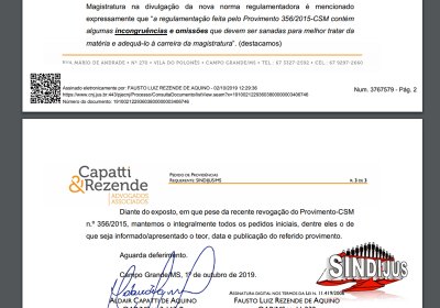 Sendo assim, o SINDIJUS-MS protocolou nesta quarta-feira (2) uma petição em complemento ao Pedido de Providências informando que apesar do novo provimento publicado pelo TJMS e a revogação do provimento/regulamentação anterior, permanece a necessidade de esclarecimentos e comprovações pelo TJMS em relação ao Provimento-CSM n.º 356/2015, que continua desconhecido pelo Sindicato.