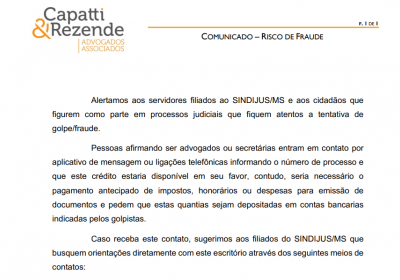 Alertamos aos servidores filiados ao SINDIJUS/MS e aos cidadãos que figurem como parte em processos judiciais que fiquem atentos a tentativa de golpe/fraude.