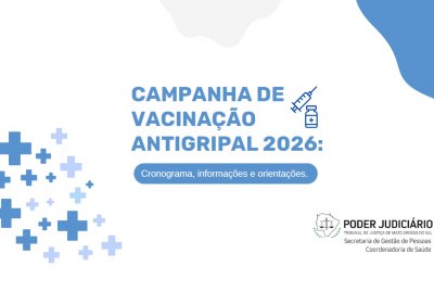 No dia 22 de abril terá início a Campanha de Vacinação Antigripal 2026 do Poder Judiciário. A imunização é gratuita, sem necessidade de inscrição prévia, sendo destinada aos magistrados e servidores ativos e inativos, pensionistas, estagiários, voluntários, residentes judiciais, menores aprendizes, juízes leigos, juízes de paz, conciliadores, mediadores, terceirizados e policiais militares do Poder Judiciário de Mato Grosso do Sul.