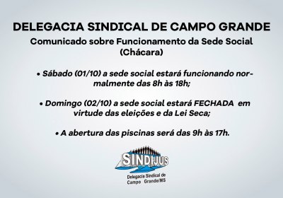 A Delegacia Sindical de Campo Grande do Sindijus comunica sobre o funcionamento da Sede Social (Chácara) neste final de semana.