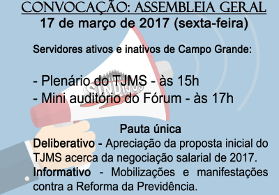 A direção geral do Sindicato dos Trabalhadores do Poder Judiciário de Mato Grosso do Sul (SINDIJUS-MS) convoca todos os servidores da comarca de Campo Grande — ativos e inativos — para participarem da Assembleia Geral, que será realizada nesta sexta-feira (17) nos seguintes locais: