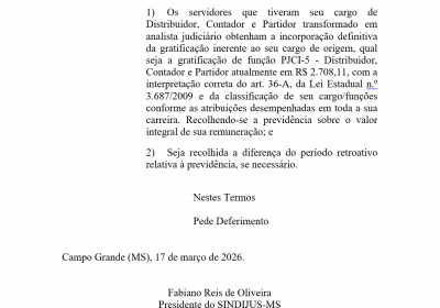 Distribuidores, Contadores e Partidores: SINDIJUS-MS protocola Pedido de Providências para requerendo incorporação total e imediata