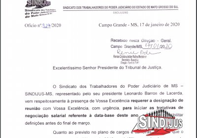A direção-geral do Sindicato dos Trabalhadores do Poder Judiciário de Mato Grosso do Sul (SINDIJUS-MS) protocolou, nesta sexta-feira (17), ofício no Tribunal de Justiça de Mato Grosso do Sul (TJMS) solicitando reunião com a presidência, com urgência, para iniciar as tratativas de negociação salarial referente à data-base deste ano, a fim de possibilitar definições antes do fim do mês de março.