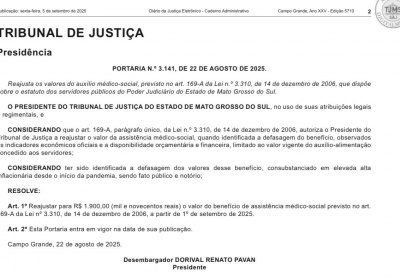 O aumento foi formalizado por meio da Portaria n.º 3.141, de 22 de agosto de 2025, publicada na página 2 do Diário de Justiça n.º 5710, de 05/09/2025. Com esse aumento, o valor passa dos atuais 1.700 reais para 1.900 reais por mês.