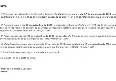 O prazo do plantão extraordinário, que suspende o expediente presencial, foi prorrogado até o dia 07 de setembro de 2020 pela Portaria n.º 1.828, de 21 de agosto de 2020, do presidente do TJMS, publicada no DJ n.º 4562 de hoje (24).
