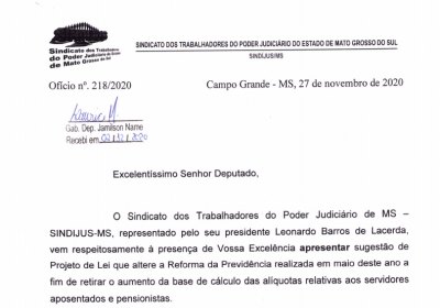 O Sindicato dos Trabalhadores do Poder Judiciário de Mato Grosso do Sul (SINDIJUS-MS), representado pelo presidente Leonardo Lacerda, protocolou ofício para os deputados estaduais e governador Reinaldo Azambuja apresentando sugestão de Projeto de Lei que altere a Reforma da Previdência Estadual, realizada em maio deste ano, a fim de se retirar o aumento da base de cálculo das alíquotas relativas aos servidores aposentados e pensionistas.