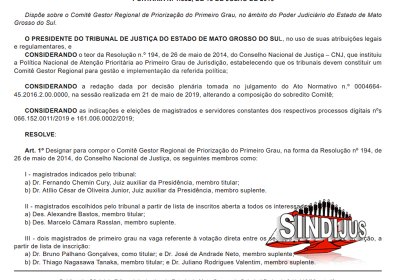 Nesta terça-feira (23) foi publicada no Diário da Justiça, a Portaria nº 1.552, de 16 de julho de 2019, sobre a composição do Comitê Gestor Regional de Priorização do Primeiro Grau, no âmbito do Poder Judiciário do Estado de Mato Grosso do Sul.
