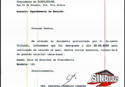 A direção-geral do Sindicato dos Trabalhadores do Poder Judiciário de Mato Grosso do Sul (SINDIJUS-MS) informa que está marcada reunião com a presidência Tribunal de Justiça de Mato Grosso do Sul (TJMS), no dia 5 de março, às 14h, para dar início à negociação salarial 2020, conforme resposta do Tribunal ao Sindicato por meio de ofício.