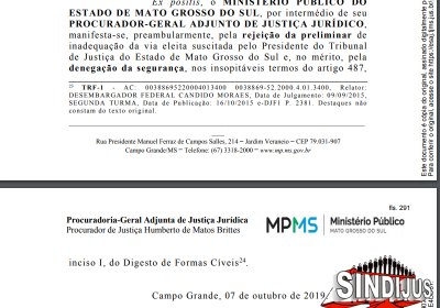 O Ministério Público do Estado de Mato Grosso do Sul, por intermédio do procurador-geral adjunto de Justiça Jurídico, Humberto de Matos Brittes, manifestou parecer negativo, no dia 7 de outrubro, quanto ao Mandado de Segurança do Sindicato dos Trabalhadores do Poder Judiciário (SINDIJUS-MS), referente ao reajuste salarial anual aos servidores do Poder Judiciário, que foi negado pelo presidente do Tribunal de Justiça, na data-base deste ano.