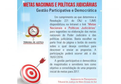 A proposta faz parte da Resolução 221 CNJ, que institui princípios de Gestão Participativa e Democrática na elaboração das metas e das políticas judiciárias. E, em cumprimento a determinação do CNJ, o Tribunal de Justiça de Mato Grosso do Sul (TJMS) disponibilizou na intranet o link para sugestões dos servidores.