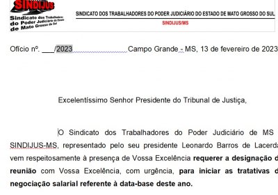 A direção-geral do Sindicato dos Trabalhadores do Poder Judiciário de Mato Grosso do Sul (SINDIJUS-MS) protocolou ofício junto ao Tribunal de Justiça (TJMS), requerendo a designação de reunião com a presidência, com urgência, para iniciar as tratativas de negociação salarial referente à data-base deste ano, com base nas demandas aprovadas pela categoria no Conselho Geral de Representantes no último sábado dia 11/02/2023.