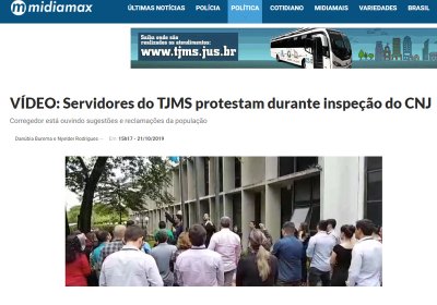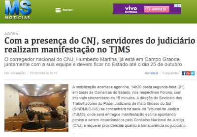 A manifestação sincronizada dos servidores do Poder Judiciário, realizada no dia 21 de outubro, com foco na inspeção do Conselho Nacional de Justiça (CNJ), teve repercussão estadual por meio de mídia espontânea, organizada pelo Sindicato dos Trabalhadores do Poder Judiciário de Mato Grosso do Sul (SINDIJUS-MS), sendo divulgada nos dias 21 e 22 de outubro pelos sites e jornal televisivo do Estado.