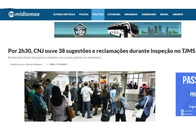 MIDIAMAX - Por 2h30, CNJ ouve 38 sugestões e reclamações durante inspeção no TJMS https://www.midiamax.com.br/politica/justica/2019/por-2h30-cnj-ouve38-sugestoes-e-reclamacoes-durante-inspecao-no-tjms