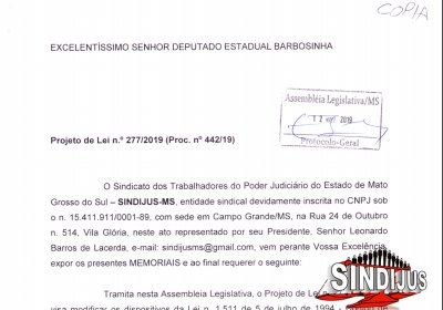 No documento, o SINDIJUS-MS requereu o sobrestamento do andamento do Projeto de Lei 227/19, para que seja verificada a existência do estudo de impacto financeiro, visto que não está disponibilizado no andamento do projeto no site da Assembleia Legislativa; Bem como seja oficiado ao TJ/MS sobre eventual autorização prévia do CNJ para pagamento de gratificação por cumulação de acervo processual, suspendendo, assim, o trâmite do Projeto de Lei.