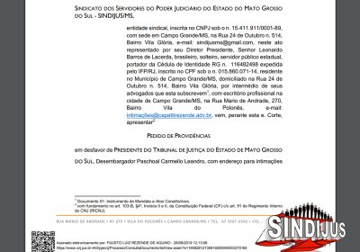 A direção-geral do Sindicato dos Trabalhadores do Poder Judiciário de Mato Grosso do Sul (SINDIJUS-MS) protocolou nesta quarta-feira (28) Pedido de Providências junto ao Conselho Nacional de Justiça (CNJ), requerendo informações detalhadas sobre gastos/orçamento do Tribunal de Justiça de Mato Grosso do Sul (TJMS), bem como sobre os pagamentos de licença-prêmio verificados nas publicações do Tribunal.