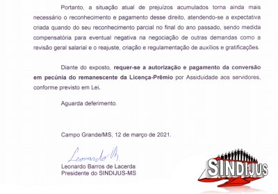 O Sindicato dos Trabalhadores do Poder Judiciário de Mato Grosso do Sul (SINDIJUS-MS) — representado pelo seu presidente Leonardo Barros de Lacerda — requereu ao presidente do Tribunal de Justiça (TJMS) por meio de Pedido de Providências a autorização e pagamento da conversão em pecúnia do remanescente da Licença-Prêmio por Assiduidade aos servidores, conforme previsto em Lei.