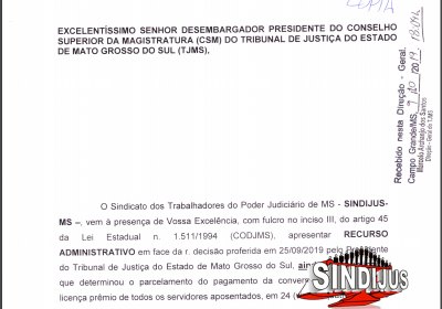 O Sindicato dos Trabalhadores do Poder Judiciário de Mato Grosso do Sul (SINDIJUS-MS) protocolou Recurso Administrativo, na última quarta-feira (9), contra a decisão proferida pelo presidente do Tribunal de Justiça de Mato Grosso do Sul (TJMS) ainda não publicada, em que determinou o parcelamento do pagamento da conversão em pecúnia da licença-prêmio dos servidores recentemente aposentados, em 24 parcelas mensais.