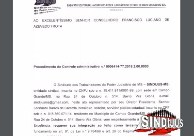 SINDIJUS-MS requer ao CNJ o ingresso como terceiro interessado no procedimento que trata sobre Residência Jurídica no TJMS