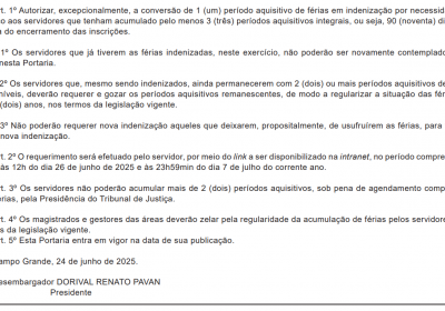Foi publicada no Diário de Justiça n.º 3100, de 27 de junho de 2025, a Portaria n.º 5.663 de autoria do presidente do Tribunal de Justiça de Mato Grosso do Sul (TJMS) desembargador Dorival Renato Pavan que autoriza e estabelece critérios para o pagamento da indenização de férias não usufruídas por necessidade de serviço aos servidores do Poder Judiciário de Mato Grosso do Sul.