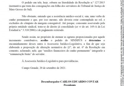 “O pedido em tela, hoje, esbarra na literalidade da Resolução n.º 127/2015 (normativa que trata das consignações em folha dos servidores do Tribunal de Justiça de Mato Grosso do Sul).