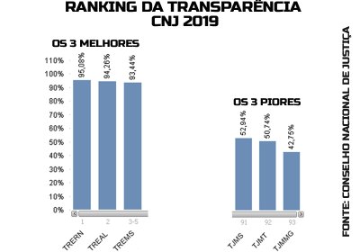 Ranking - O ranking da Transparência foi instituído pela Resolução 260/2018, e tem como objetivo estimular os órgãos a disponibilizarem suas informações de forma mais clara e padronizada à sociedade e, assim, facilitar o acesso aos dados dos conselhos e tribunais. Tribunais e conselhos do Poder Judiciário participaram da avaliação.