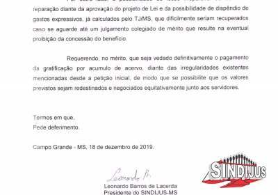 Até então, a solicitação era para que o TJMS retirasse o então Projeto de Lei de tramitação da Assembleia Legislativa de Mato Grosso do Sul. No entanto, com a sanção da Lei, o SINDIJUS-MS protocolou, nesta quarta-feira (18), Procedimento de Controle Administrativo no CNJ para a não efetuação do pagamento.